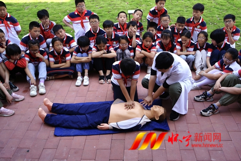 5月19日,在月山鎮中心學校,鎮衛生院醫護人員和志愿者現場向學生們教學如何開展自救和互救。