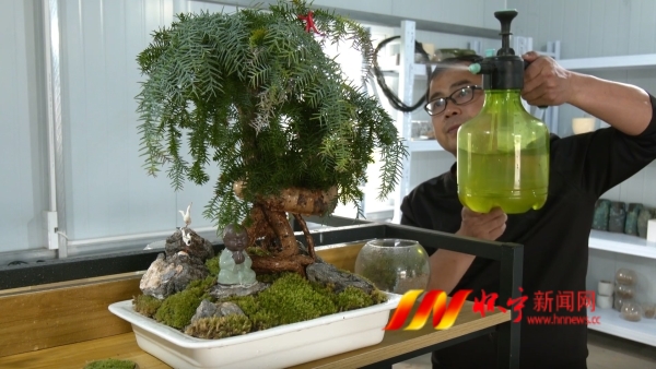 走進臘樹鎮白石村種植基地,村干部李雨生正在對苔蘚微景觀進行澆水養護,這些苔蘚微景觀巧妙搭配石頭、綠色小植物及人物、動物模型等,營造出一派綠意盎然、生機勃勃的景象。“像我們村打造的這個‘黃山松’微景觀,它的元素比較多,下面是苔蘚,上面是石頭,還有樹,在市場上很受歡迎,價格在800塊錢左右。”臘樹鎮白石村村委委員李雨生介紹道。